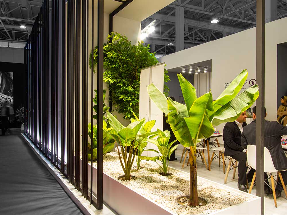 غرفه فرش بهشتی 1401 : پس از استقبال بسیار خوبی که از غرفه فرش بهشتی در نمایشگاه بین المللی فرش ماشینی سال قبل شد، تصمیم بر این شد تا المان های تاثیر گذار غرفه ی سال گذشته با تغییراتی جزیی در طرح جدید به کار گرفته شوند. از این رو پروفیل های فلزی نمای بیرونی غرفه که هویتی منحصربفرد به غرفه فرش بهشتی میداد، بار دیگر مورد استفاده قرارگرفت. غرفه این بار هم از دو وجه دارای ورودی بود تا سیرکولاسیون حرکت بازدیدکنندگان بخوبی برقرار گردد. بکارگیری فضای سبزی نسبتا بزرگ در کنار یکی از ورودی ها و استفاده از نورپردازی های جدید، در تکمیل طرح غرفه بسیار موثر بود.